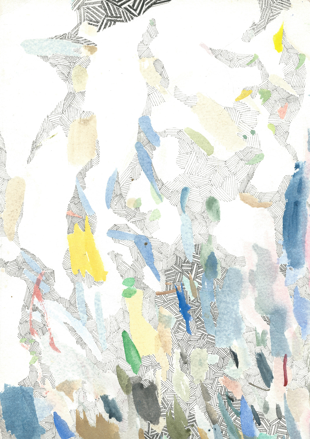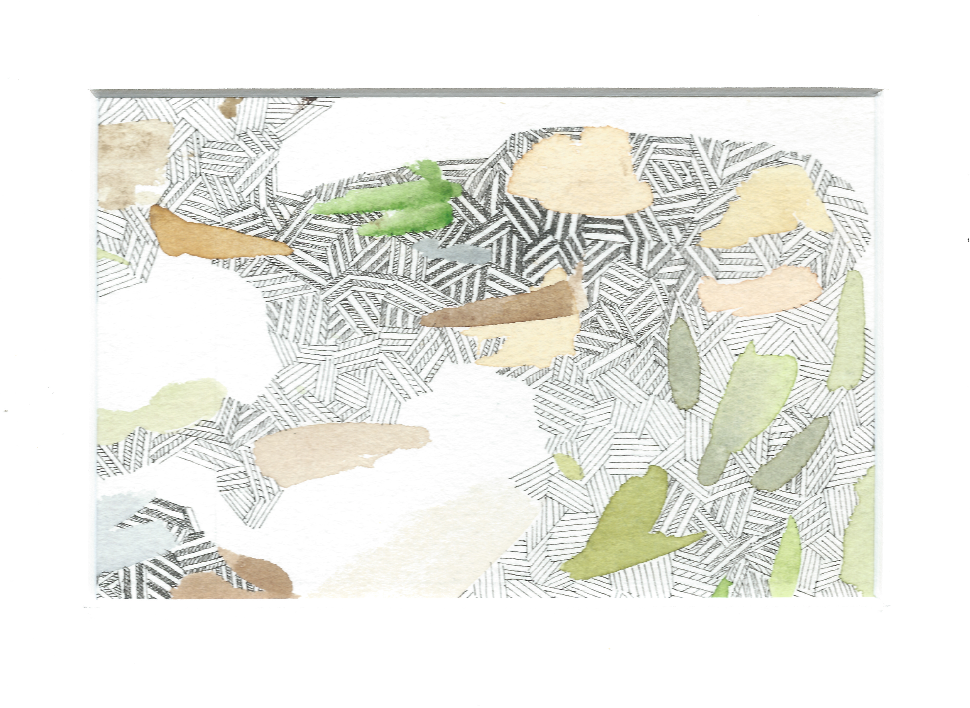 Dans cette série, je redécouvre les aquarelles de mon grand-père, territoire abandonné et oublié. Le travail crée une connexion hors du temps et de l’espace. Retravailler ses aquarelles établirait une relation artistique intense avec lui que j’ai peu connu. Je repasse là où sa main est passé, je complète, cache, rature, corrige, tantôt élève et tantôt maître. C’est un travail sur l’oubli, la filiation et la mémoire, la redécouverte d’un espace artistique et les souvenirs qui dorment.
