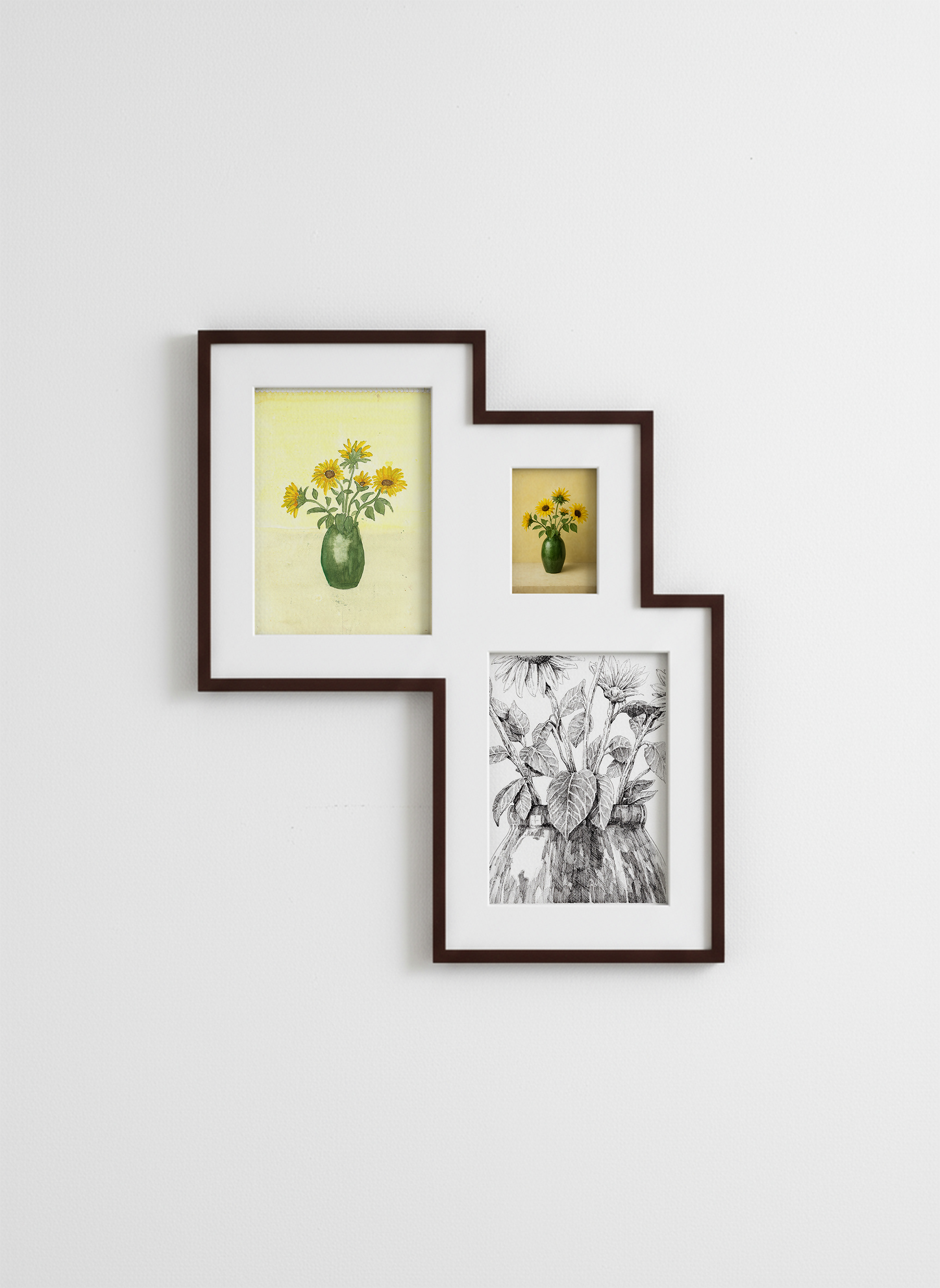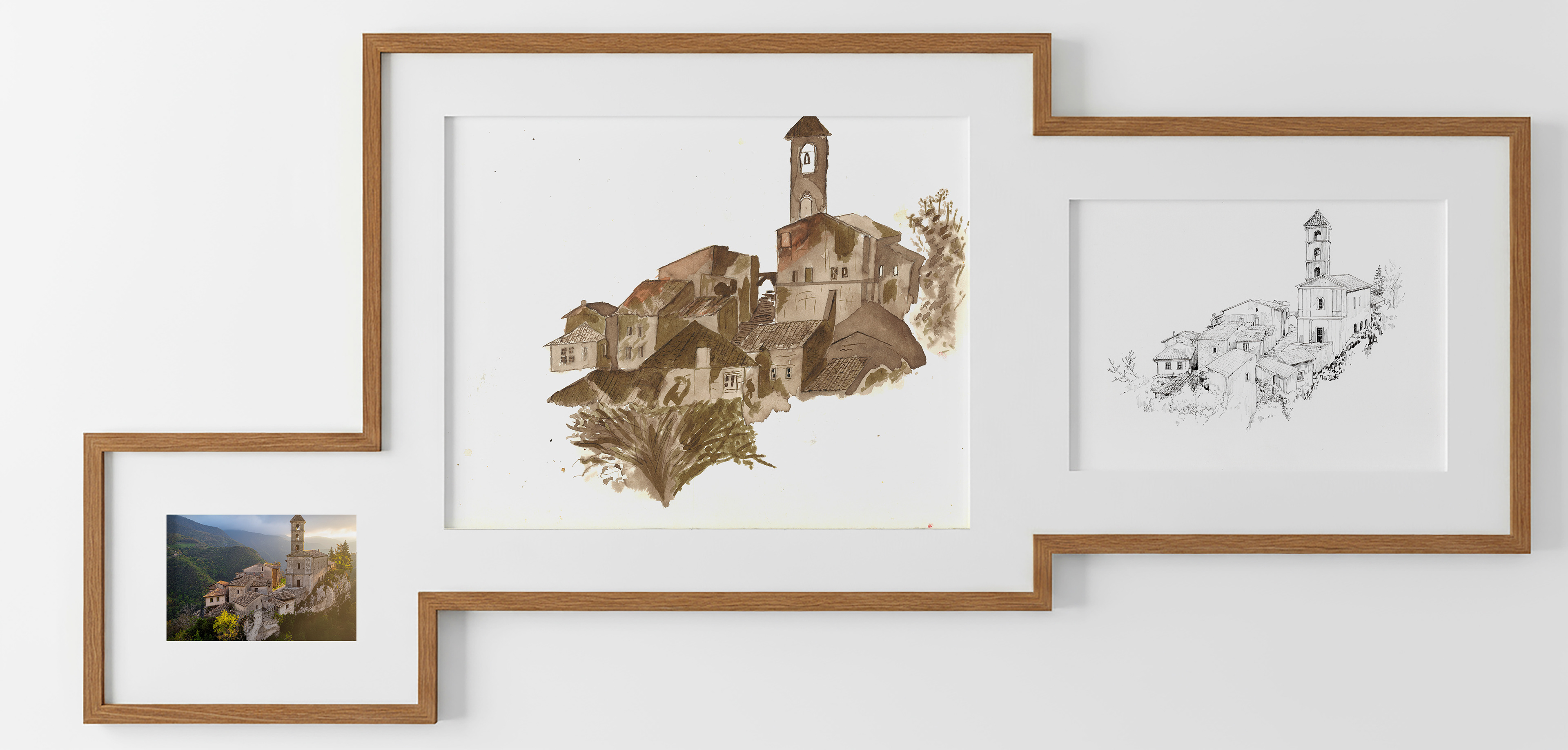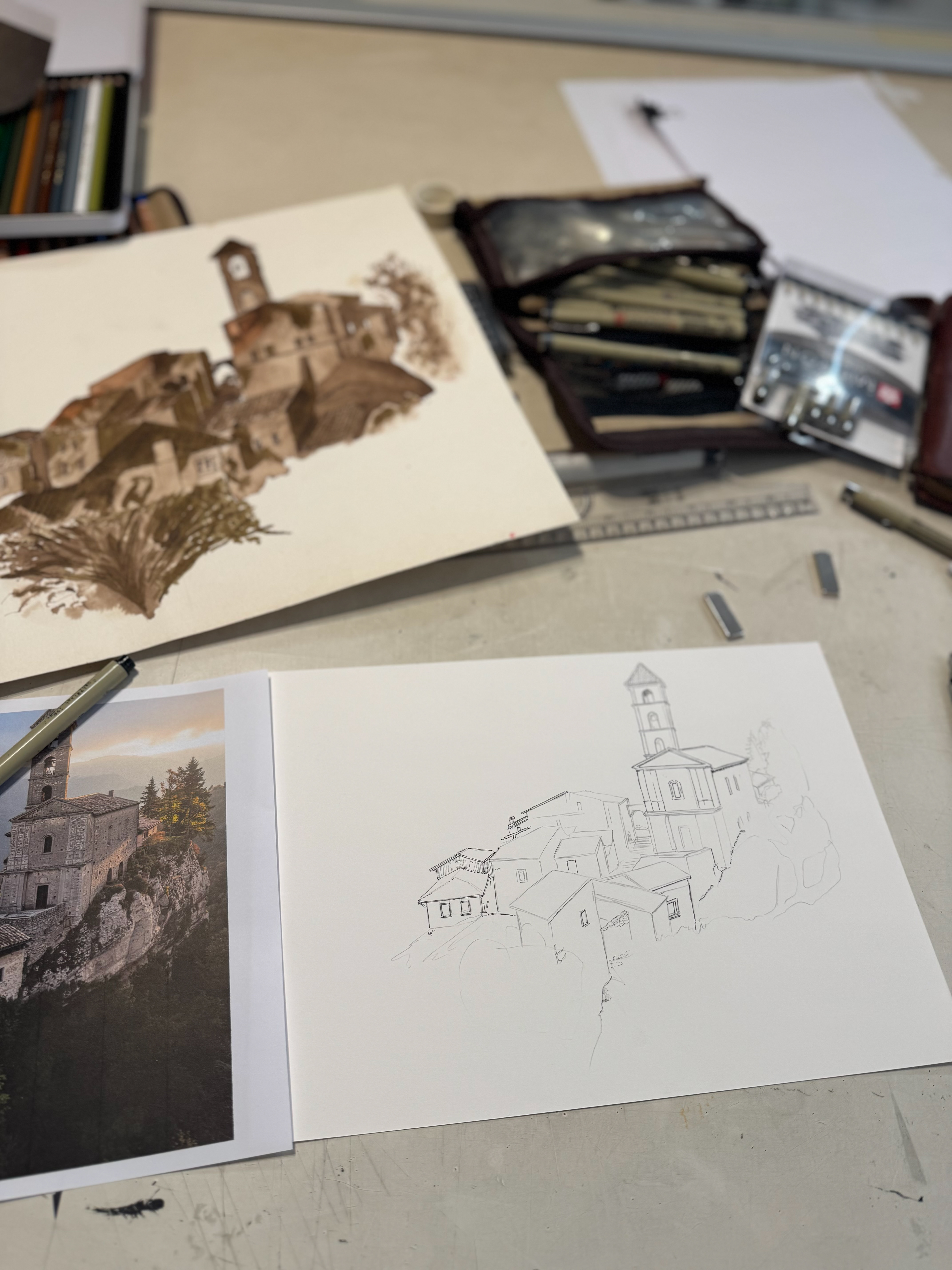 Je dois extrapoler, et imaginer la source par de constants aller-retours entre les deux versions dont je dispose.Les médiums varient également car j’envisage d’utiliser le matériel et certains papiers vierges qui m’ont été transmis par mon aïeul.